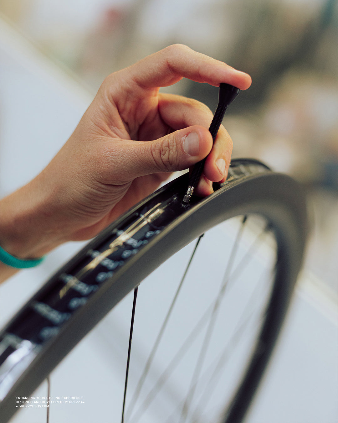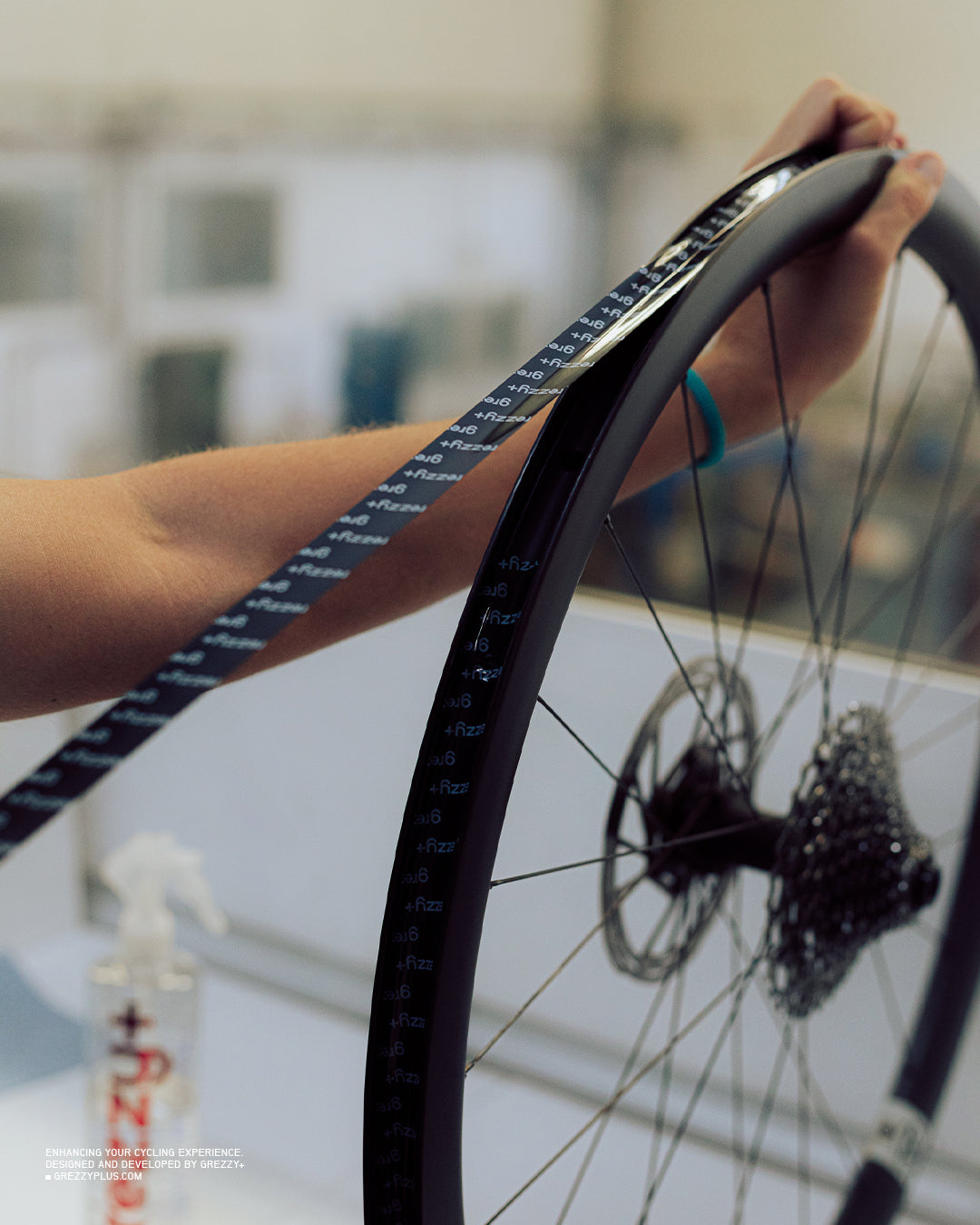 A continuación, instala la cinta en la llanta pegando primero unos 15 cm y estirando la cinta hasta completar una vuelta, añadiendo unos 5 o 10 cm adicionales que pegarás sobre la primera vuelta. Es importante instalar la cinta manteniendo una alta tensión sobre ella, de esta manera ayudamos a que se adapte perfectamente a las formas de la llanta y pueda adherirse mejor.