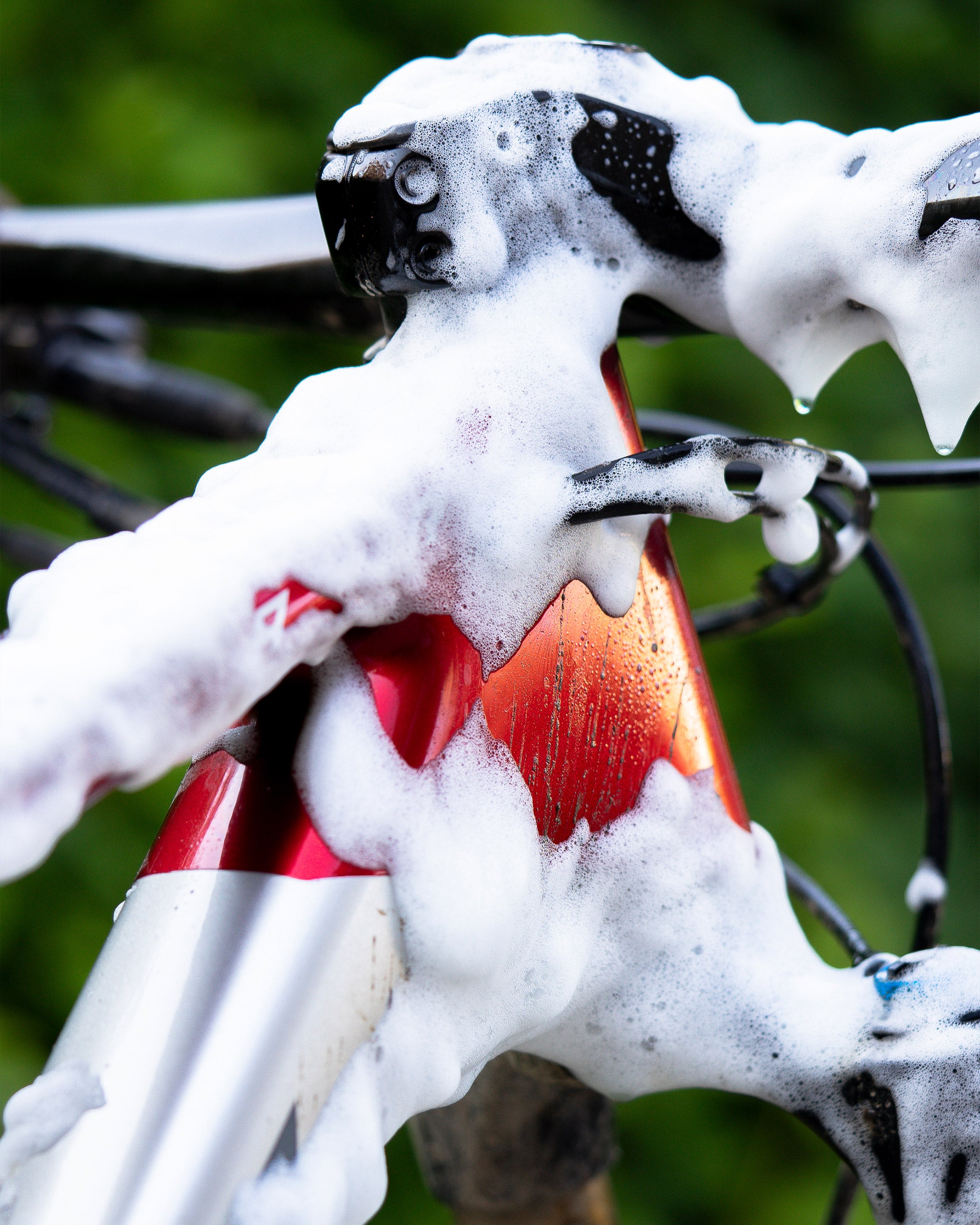 Aplica la espuma activa directamente sobre las partes previamente humedecidas de la bicicleta. Deja actuar unos segundos y remueve la suciedad con una esponja o similar. Enjuaga con agua hasta eliminar toda la espuma y seca con un paño seco.